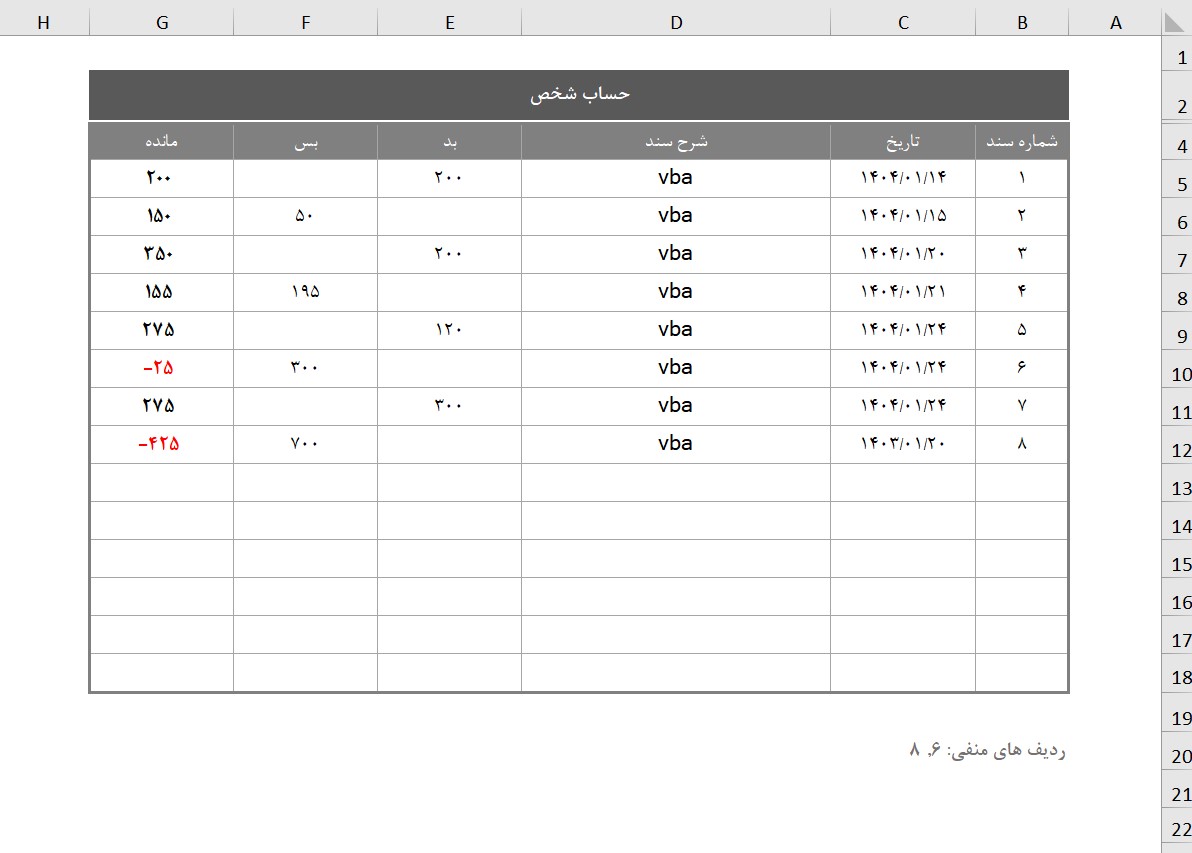 در تصویر زیر، یک جدول حسابداری ساده را مشاهده میکنید که شامل ستونهای تاریخ، شرح سند، مبلغ بدهکار (بدهکار) و مانده است. با استفاده از کد VBA، مانده هر ردیف به صورت خودکار محاسبه شده است.
