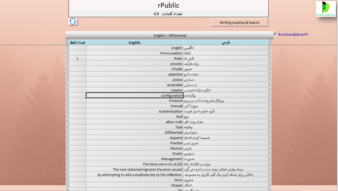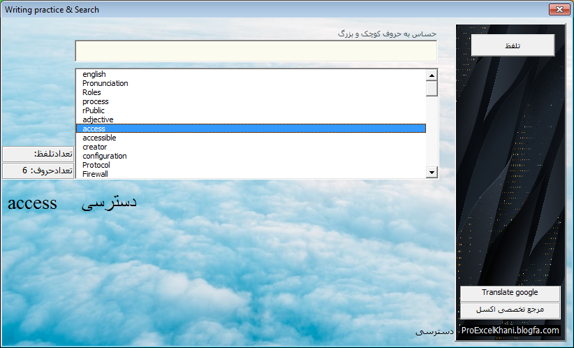 در این صفجه قصد دارم محصولی که توسط بنده، با مایکروسافت اکسل طراحی و ساخته شده را برای علاقهمندان به اکسل و همچنین علاقه مندان به یادگیری زبان انگلیسی را معرفی کنم. این محصول، ترکیبی از VBA و فرمول نویسی اکسل تهیه شده و دارای امکانات به شرح زیر است: